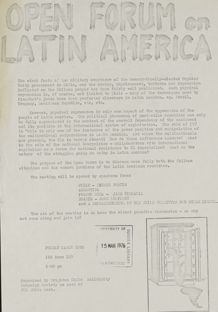 Home-made flyers, such as the one below, from the University of Sussex – Student campaigns and movements collection are an anachronism these days, making us assess just how quickly the world has turned digital. Advertising an Open Forum on Latin America, its handwritten title and poor copying jolts us back to 1976 and reminds those of us old enough; to remember just how difficult it was to advertise small events.
