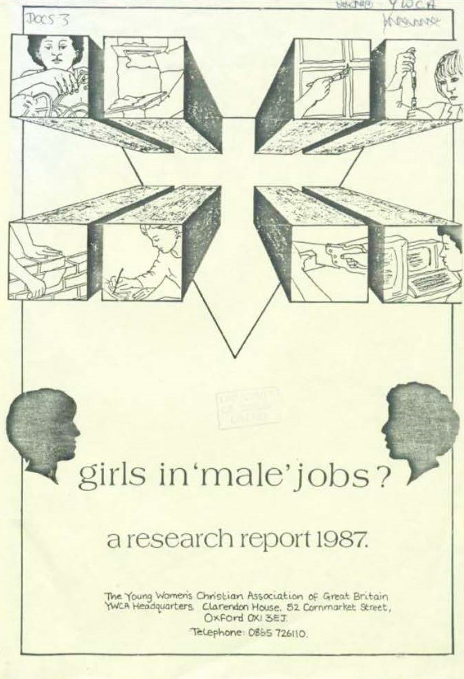 From the Observing the 1980’s ephemera collection, girls in ‘male’ jobs?: a research report 1987 from the Young Women’s Christian Association of Great Britain, which seeks to encourage and aid ‘young women in non-traditional training and work’ such as engineering and construction. It looks into the experiences of women working and undertaking apprenticeships in male dominated areas and the general trends in what were thought of as ‘male’ or ‘female’ jobs.