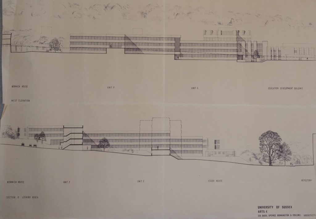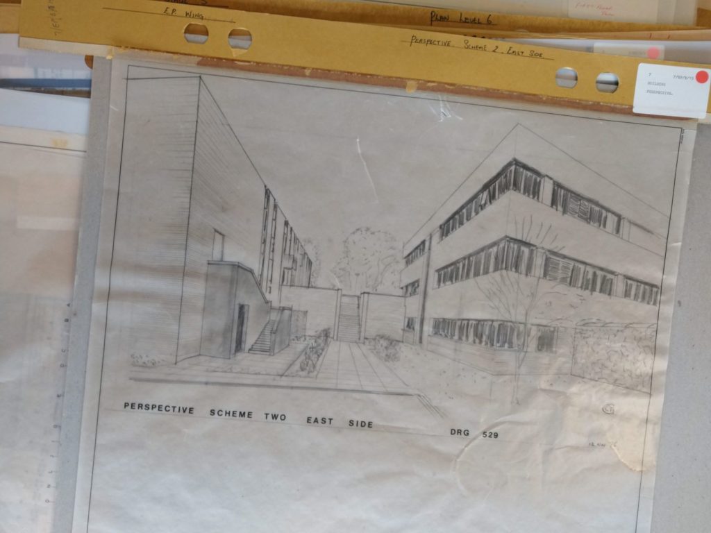 Plans. It’s a bit tricky to make any at the moment. Luckily that wasn’t the case when the University of Sussex was commissioning new buildings and renovating student residences over the past 50 or so years. In October last year, I was contacted by the Estates team who had a large cabinet of architectural plans in their offices which they thought should be looked after long term at The Keep. That’s exactly what I thought. There are lots of architectural plans already in the University of Sussex Collection dating from the 1960s and they have been used extensively by lots of researchers. Recently they were consulted by 3rd year Drama students researching the history of the Attenborough Centre for the Creative Arts (ACCA), formally the Gardner Arts Centre.