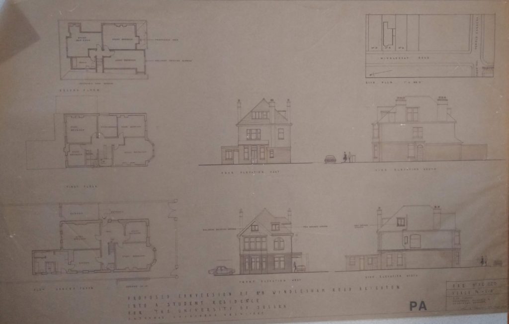 Now that the plans are safely at The Keep, I’ve been able to have a look through them. There are approximately 200 campus plans including building elevations, perspectives, heating and fire layouts, renovations. I was super please to see that the campus building plans include ones for Arts 4(D) and 5(E) which is where the Jubilee building is now. A lovely surprise is the over 80 plans for buildings off campus including student residences in Falmer village, Windlesham Road in Hove and Victoria Road in Brighton. The date span is from the late 1960s to 1990s and the plans get really big from around 1994, maybe the architectural firm got a new printer. The largest ones are 1085x820mm, the smallest around 880x590mm. These plans have been hanging up so are not creased or rolled and it would be nice to keep them that way. Storage solutions for these are on my list when I can work on site at The Keep.