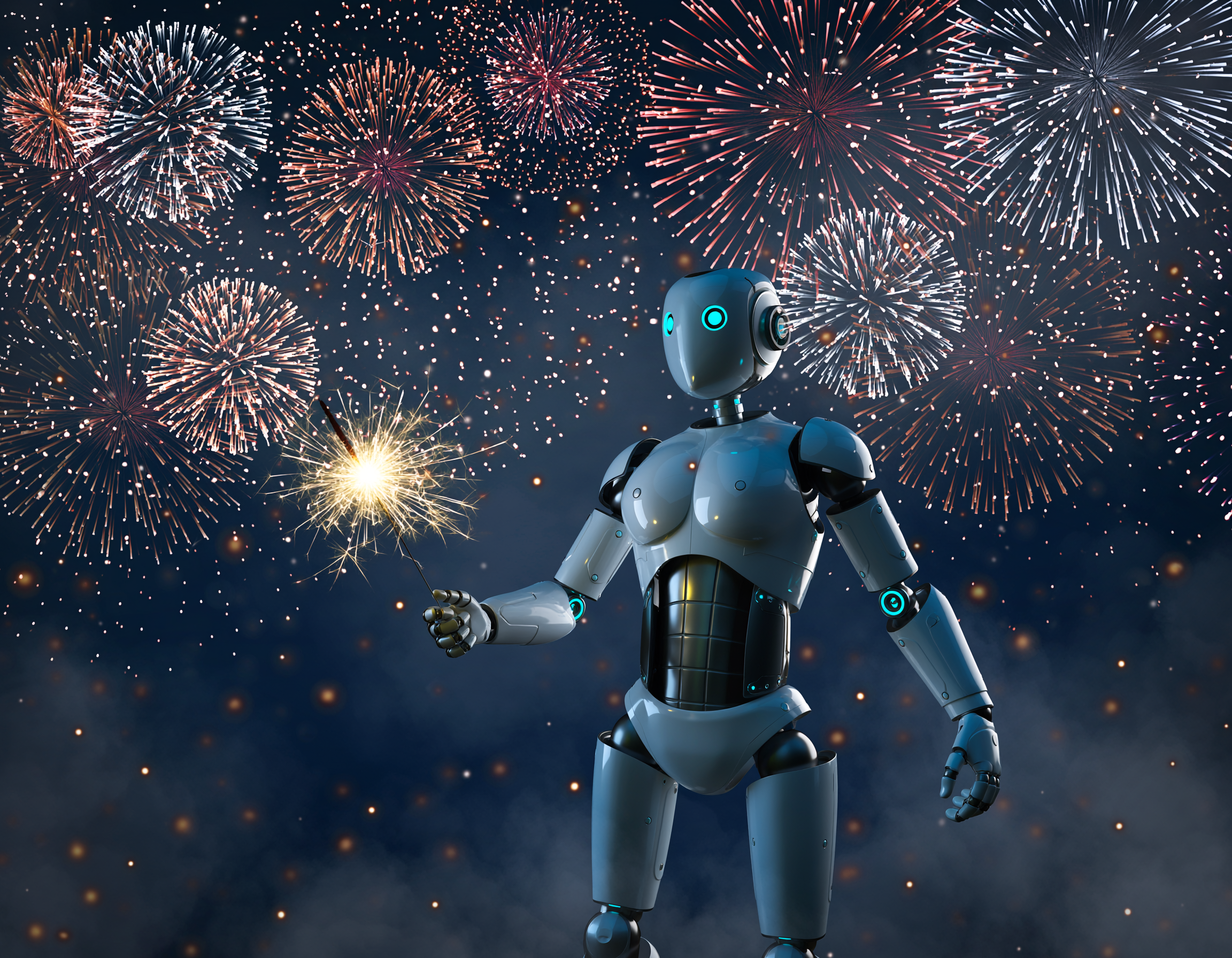 Image generated using Adobe Firefly, 19th November 2025, by HM using prompt “a robot at a fireworks display holding a sparkler“.