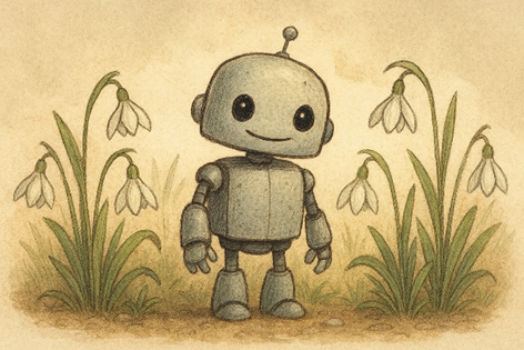 Image generated by HM using CoPilot. 27th February 2026. Prompt: “Draw a robot and some snowdrops”.